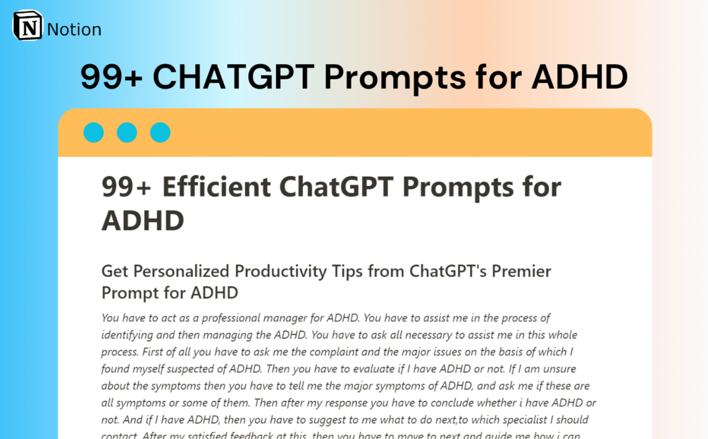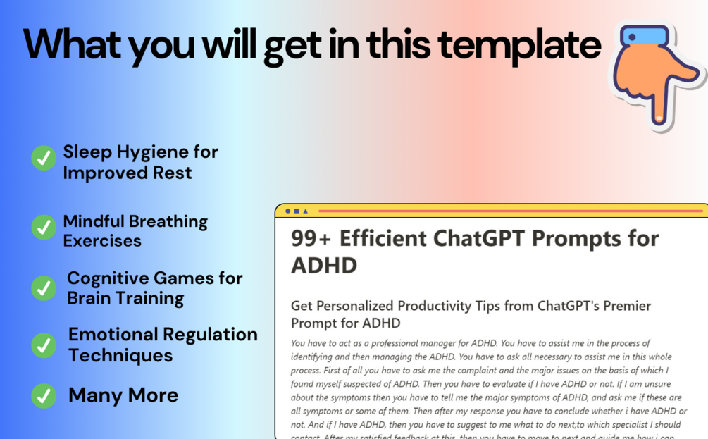 - How will these prompts help me with ADHD?They offer practical, easy-to-implement strategies, saving time and simplifying daily challenges associated with ADHD.