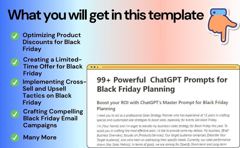 Supercharge your Black Friday sales game with ChatGPT Prompts for Black Friday Sales Planning! Our easy-to-use prompts and tailored sets empower you to revolutionize your strategy, maximizing revenue and minimizing stress. From targeted marketing insights to data-driven analytics, this ultimate toolkit ensures you navigate diverse sales scenarios with precision. Invest in success, save time, and elevate your Black Friday sales experience with ChatGPT Prompts. ππ°