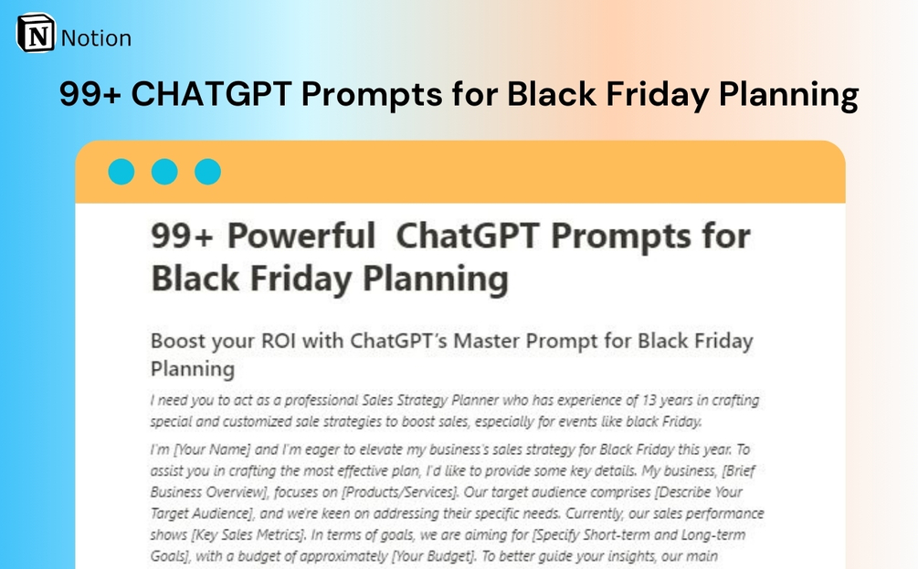 - What benefits do ChatGPT Prompts for Black Friday Planning offer to Businesses? Streamline your Black Friday sales strategy effortlessly, ensuring you optimize promotions and boost sales with our easy-to-use prompts.