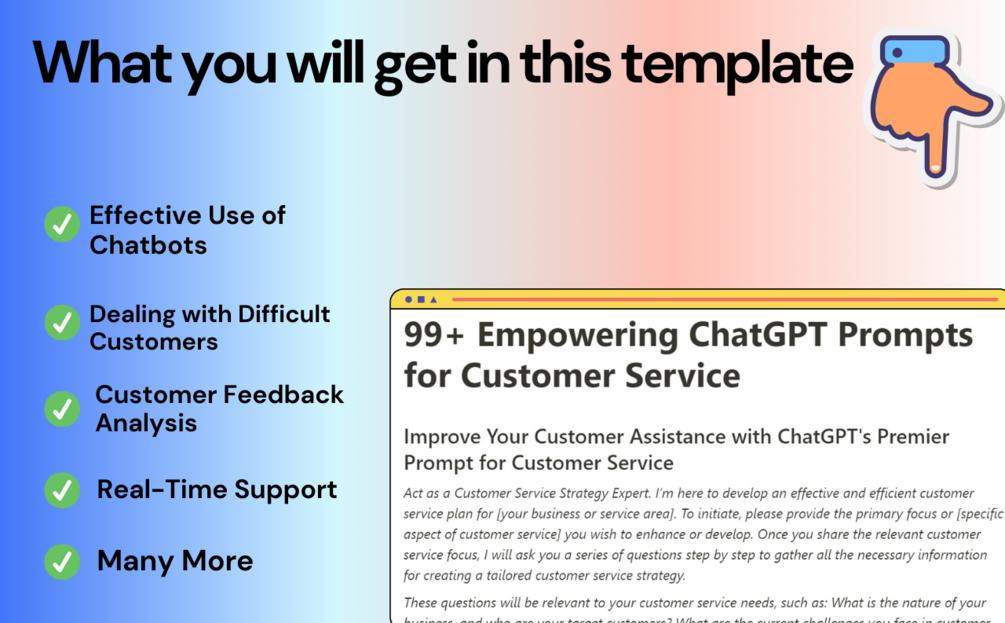 - What can I expect from ChatGPT Prompts for Customer Service? Our prompts offer diverse solutions for every customer query, ensuring efficient and effective service at an unbeatable price.