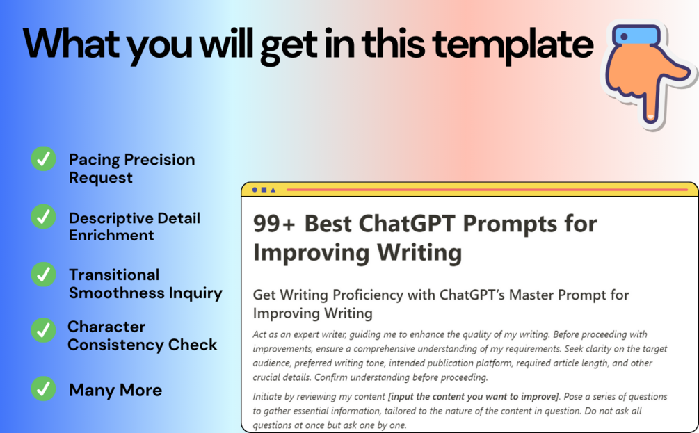 From creative projects to professional content, ChatGPT Prompts for Improving Writing empowers you to enhance your writing proficiency, spark creativity, and simplify the process of crafting compelling narratives.