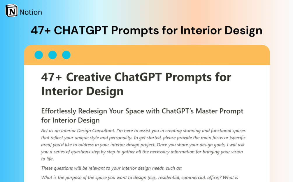 - What areas do ChatGPT Prompts for Interior Design cover?From color schemes to furniture arrangement, our prompts provide comprehensive guidance for transforming your space.