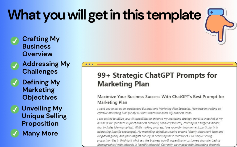 Supercharge your marketing game with ChatGPT Prompts for Marketing Plan! Unleash creative campaigns effortlessly, save time with tailor-made strategies, and captivate your audience. Crafted for marketers of all levels, these prompts offer versatile solutions for diverse marketing contexts, empowering you to optimize strategies and engage effectively. Invest in the ultimate toolkit to elevate your campaigns, solve marketing challenges, and watch your success soar! 🚀🌐