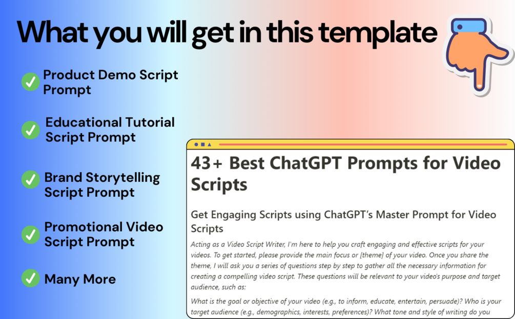 - How do these prompts enhance video scripting efficiency?Elevate your creativity, save time, and streamline your scripting process with our intuitive prompts.