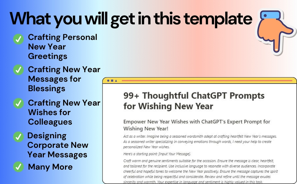 Elevate your New Year wishes effortlessly with ChatGPT Prompts for Wishing New Year! Craft heartfelt messages for friends, family, and colleagues with personalized prompts. Save time and make your greetings memorable. Invest in this ultimate toolkit to simplify your New Year wishes and bring warmth to your celebrations. πβ¨