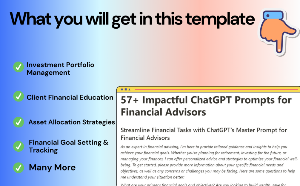 These are crafted for financial professionals, advisors, and consultants seeking to enhance client interactions and optimize financial strategies. These prompts provide invaluable support in guiding conversations and driving financial success.