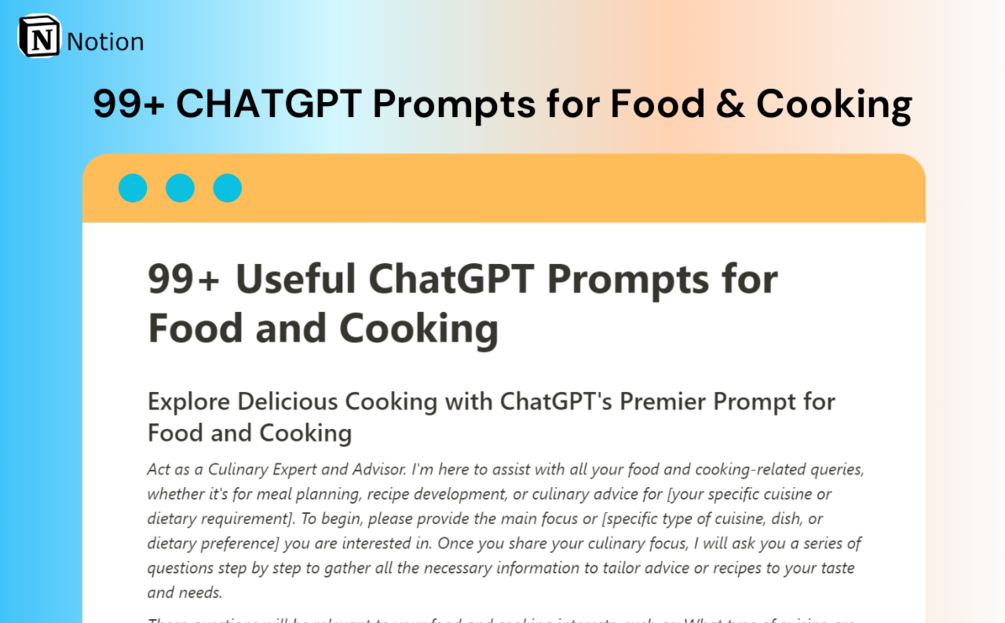 From crafting mouthwatering recipes to exploring new cooking techniques, ChatGPT Prompts for Food and Cooking empowers you to enhance your culinary journey, spark creativity in the kitchen, and simplify the process of meal planning.