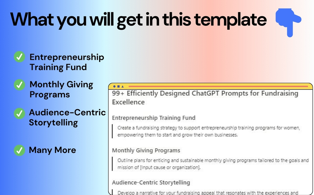 - What's included in the 99+ ChatGPT Prompts for Fundraising?Our prompts encompass a wide array of fundraising-related categories, ensuring adaptability for diverse causes, organizations, and campaign goals.