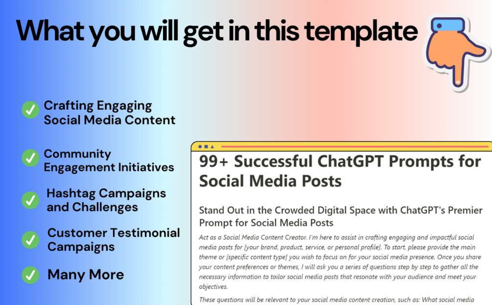 - Do you provide ongoing support or updates for these prompts? Yes, count on continuous updates and support to keep your social media content creation strategy fresh and effective. We're committed to helping you stay ahead in the ever-evolving world of social media.