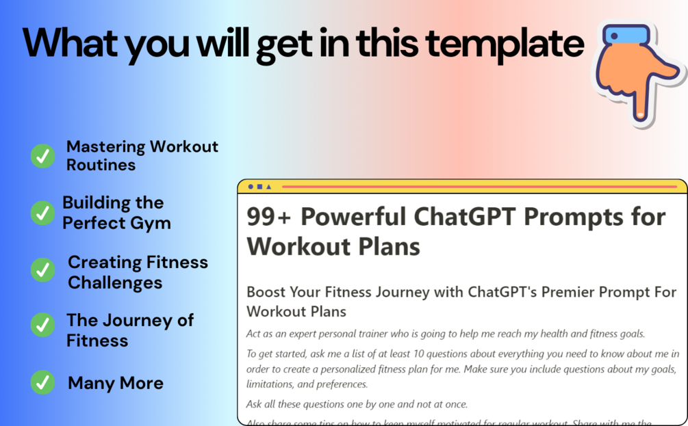 From tailoring personalized exercise routines to boosting your motivation, ChatGPT Prompts for Workout Plans empowers you to elevate your fitness journey, ignite your enthusiasm, and simplify the process of achieving your health and wellness goals.