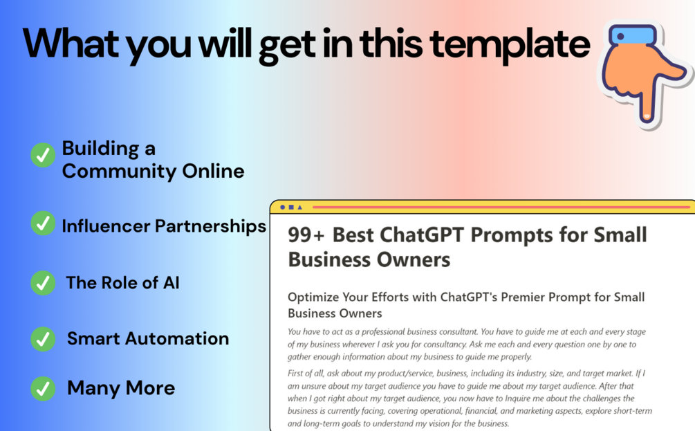 Tailored for small business owners, these prompts help you captivate customers, save time, and elevate your business strategies game. Invest in a toolkit that simplifies your business strategy, making your business stand out and succeed. Say goodbye to hassles and hello to growth!